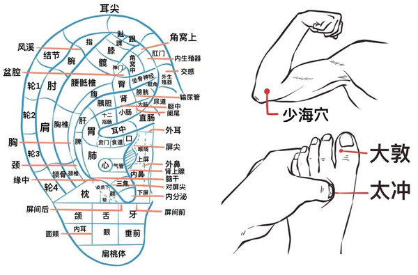 耳穴或穴位按压有助于改善焦虑抑郁情绪,建议使用心、肝、神门、交感、皮质下、内分泌等耳穴,以及太冲穴、大墩穴、期门穴、章门穴等进行一定时间的按压。