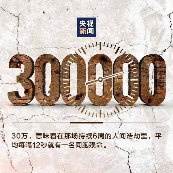 300000,意味着什么? 2022-12-31 124 字号 今天(12月13日) 第九个南京大屠杀死难者国家公祭日 1937年12月13日,侵华日军在南京开始了40多天惨绝人寰的大屠杀,超过30万同胞惨遭杀戮。你可知道,30万意味着什么? 昭昭前事,惕惕后人 今天是国家公祭日 以国之名祭奠同胞 勿忘历史,吾辈自强! 返回列表 热门新闻