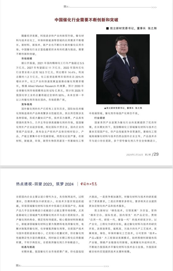 2024年1月16日,《中国化工信息》杂志刊发公司董事长张之翔署名文章:中国催化行业需要不断创新和突破。