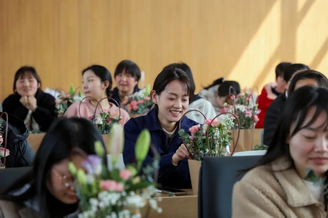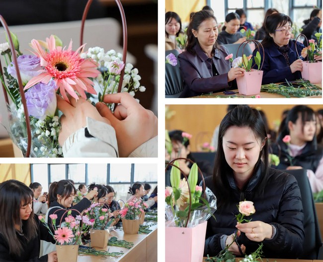 活动现场,花香弥漫,色彩缤纷。专业花艺老师从花材选择、插花技巧、构图配色等方面带领大家学习插花知识,介绍了每种鲜花的名称、寓意,重点讲解了插画的造型,并进行了插花展示,女职工们在花艺老师的指导下用灵巧的双手对花材进行修剪、整枝,根据不同的色彩与花型进行搭配,在轻松愉快的氛围中先后完成了各自的插花作品,在体验插花乐趣的同时,感受到了插花艺术的魅力。