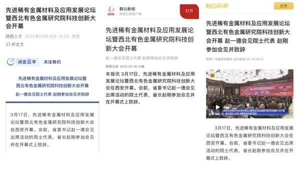 3月17日,先进稀有金属材料及应用发展论坛暨西北有色金属研究院科技创新大会开幕。论坛受到广泛关注,陕西电视台、陕西日报、西安日报等及时重点宣传,秦科技、陕西人才、陕西先锋、创新西安等多家媒体第一时间转发报道。