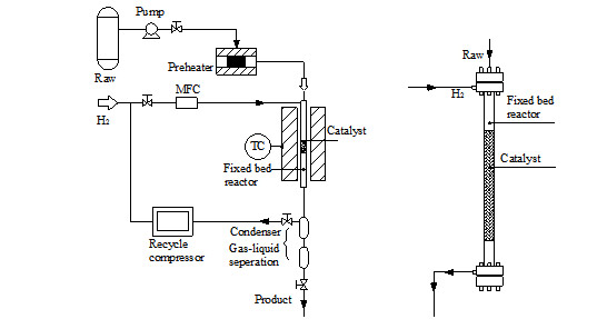 专用催化剂装填在反应器内,经过活化和预处理后,高压泵打入原料,氢气一直保持连续进出,并过量,原料液经过催化剂床层进行加氢反应生成产物,然后经过电磁阀排出,整个反应过程一直保持原料液的连续进入和产物的连续排出。